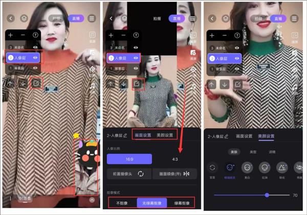 (4)到人像层,双指缩放调整人像大小,长按不松可以拖动位置,进行画面设置和美颜